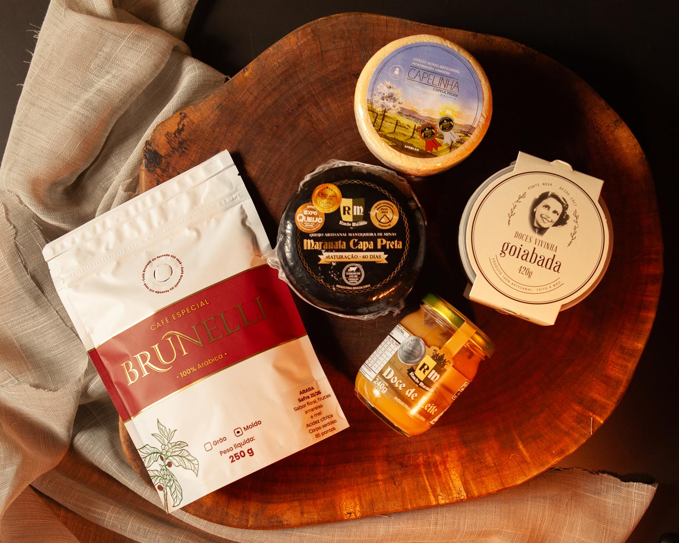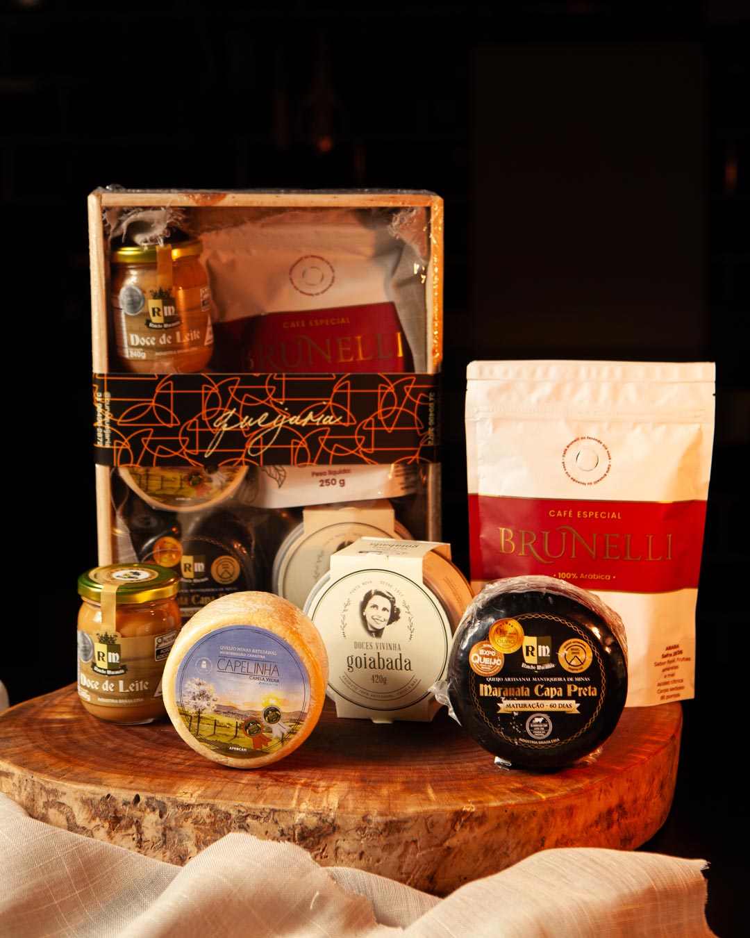 O Kit Mineiro celebra essa herança com ícones do sabor mineiro: queijos consagrados, goiabada clássica, doce de leite cremoso e delicado e café de qualidade indiscutível.