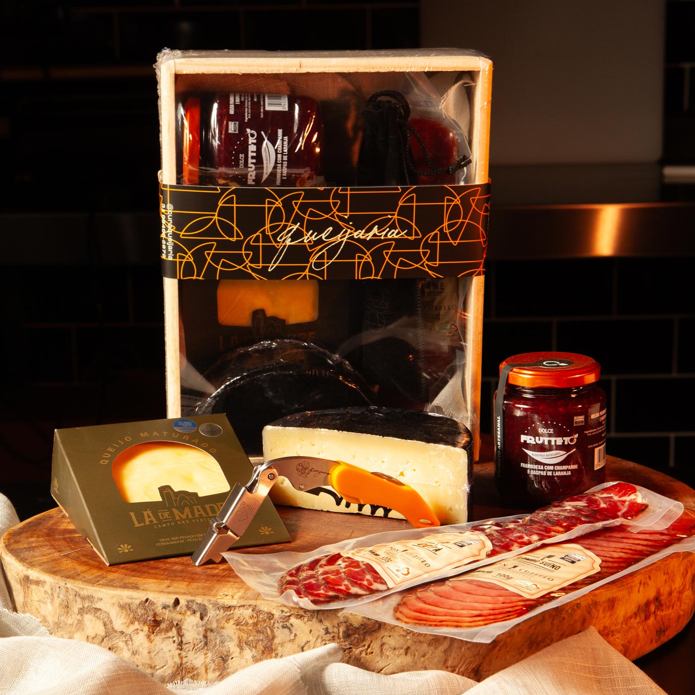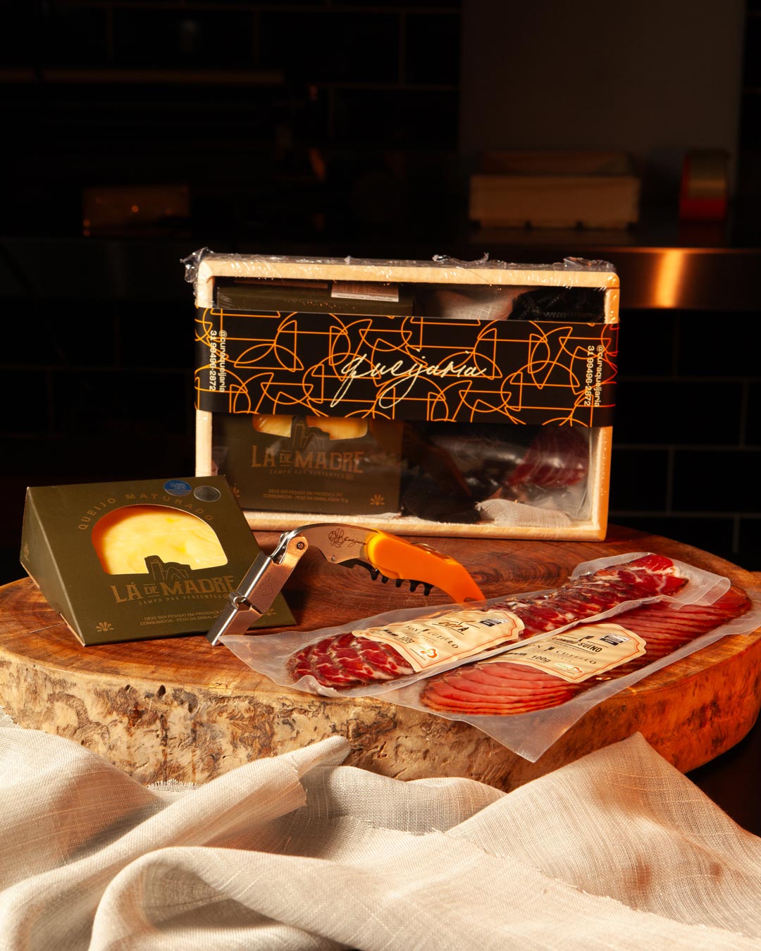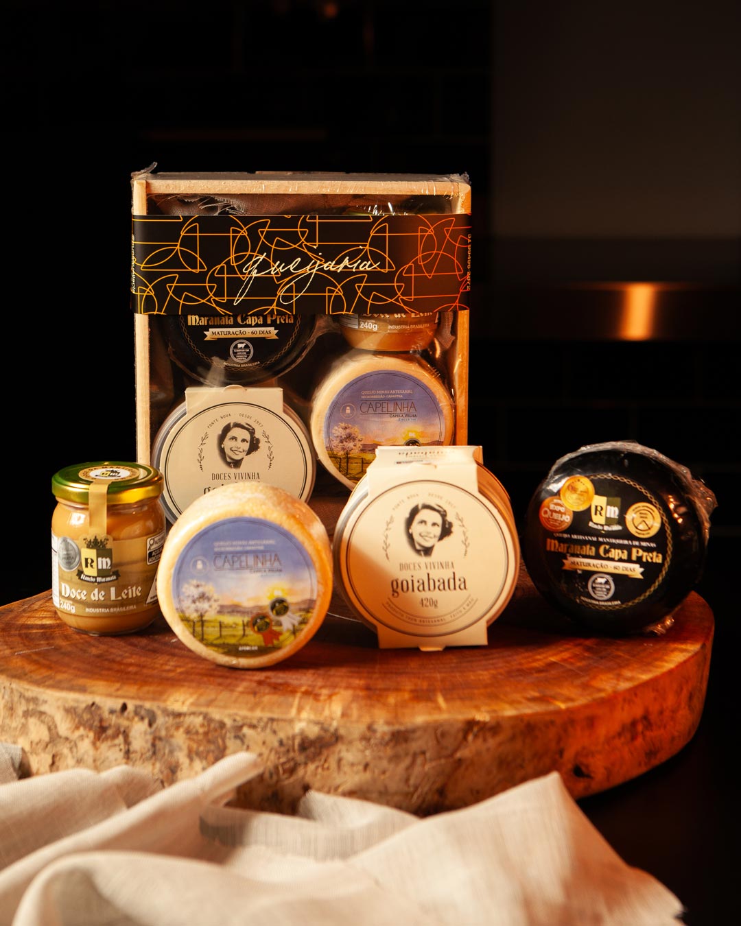 Todos os kits são acondicionados em caixotes de madeira pinus, selados com plástico termoencolhível e finalizados com cinta decorativa da Cura Queijaria.