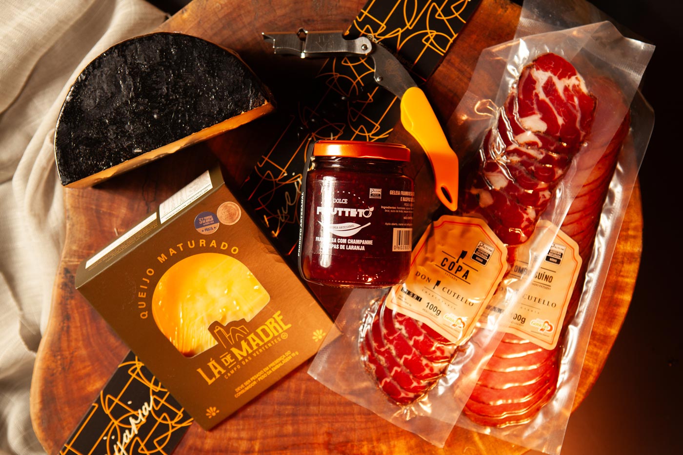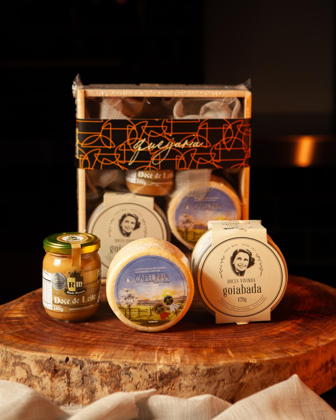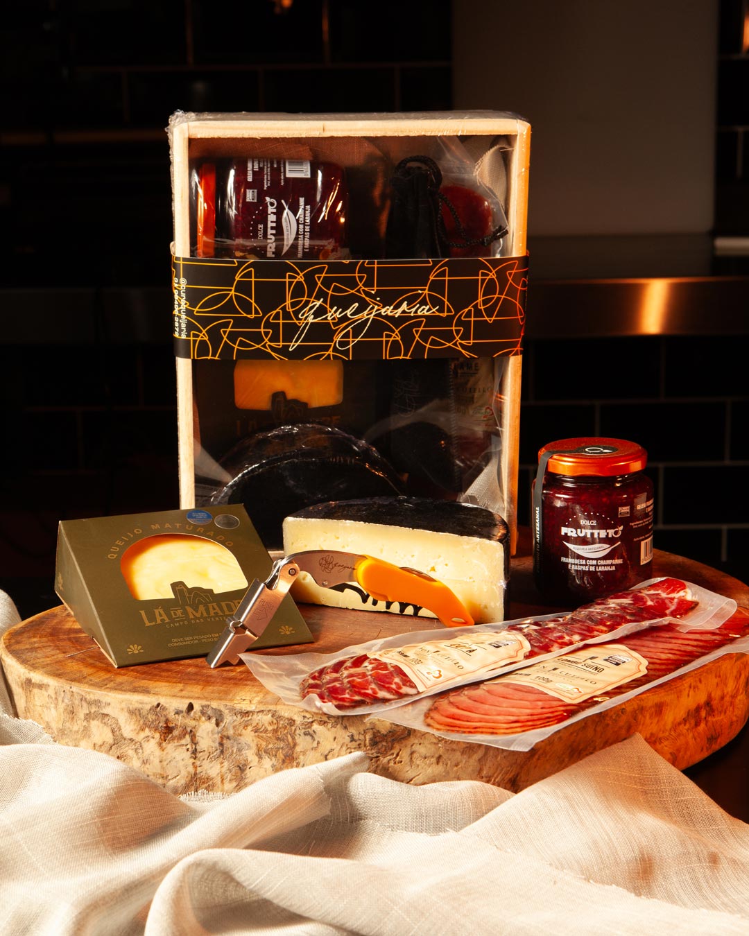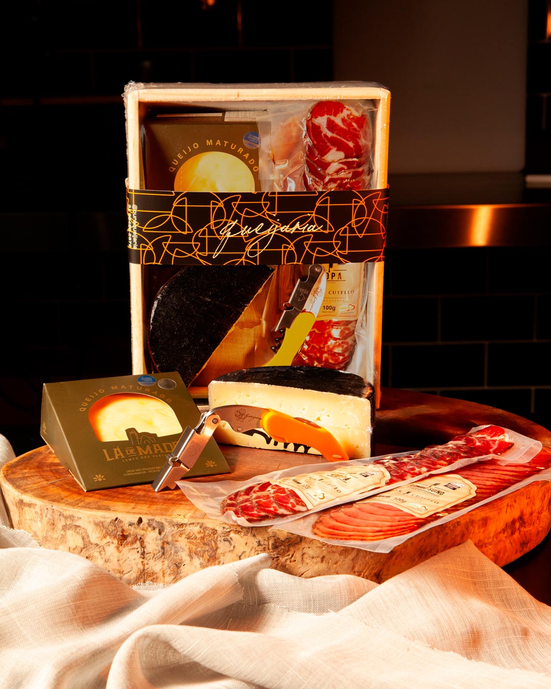 Todos os kits são acondicionados em caixotes de madeira pinus, selados com plástico termoencolhível e finalizados com cinta decorativa da Cura Queijaria.