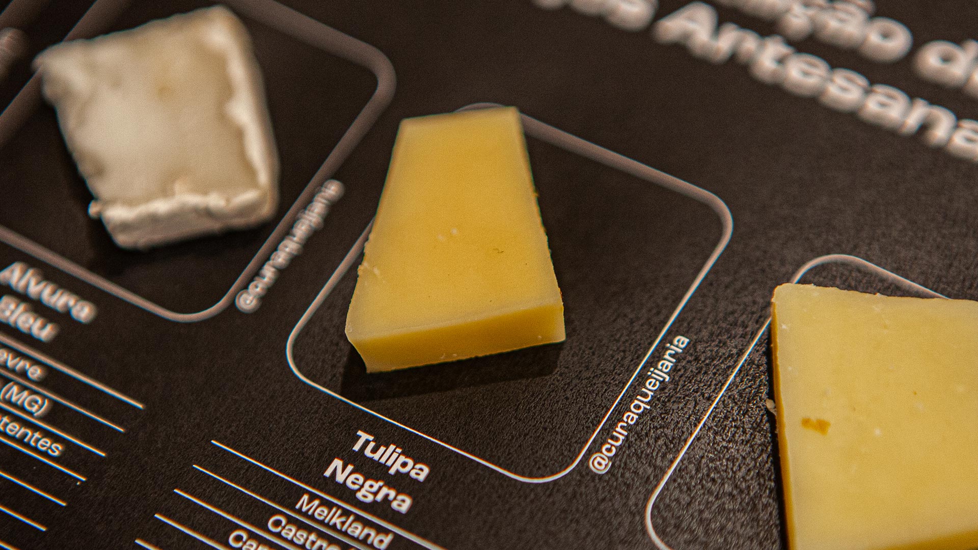 Começamos pelo Tulpen, inspirado no tradicional Maasdam holandês. Produzido pela Melkland, em Castro (PR), é um queijo untuoso, levemente adocicado e com notas amadeiradas — perfeito para derreter ou harmonizar com cervejas tipo stout ou vinhos com passagem por barrica.